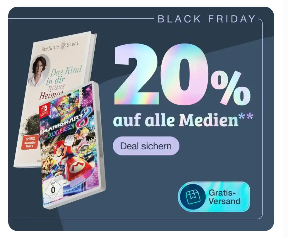 Des Weiteren bekommt ihr 20 % Rabatt und kostenloser Versand auf Medien ab einem Mindestbestellwert von 35 € mit dem Gutscheincode REBUYFRIDAYM