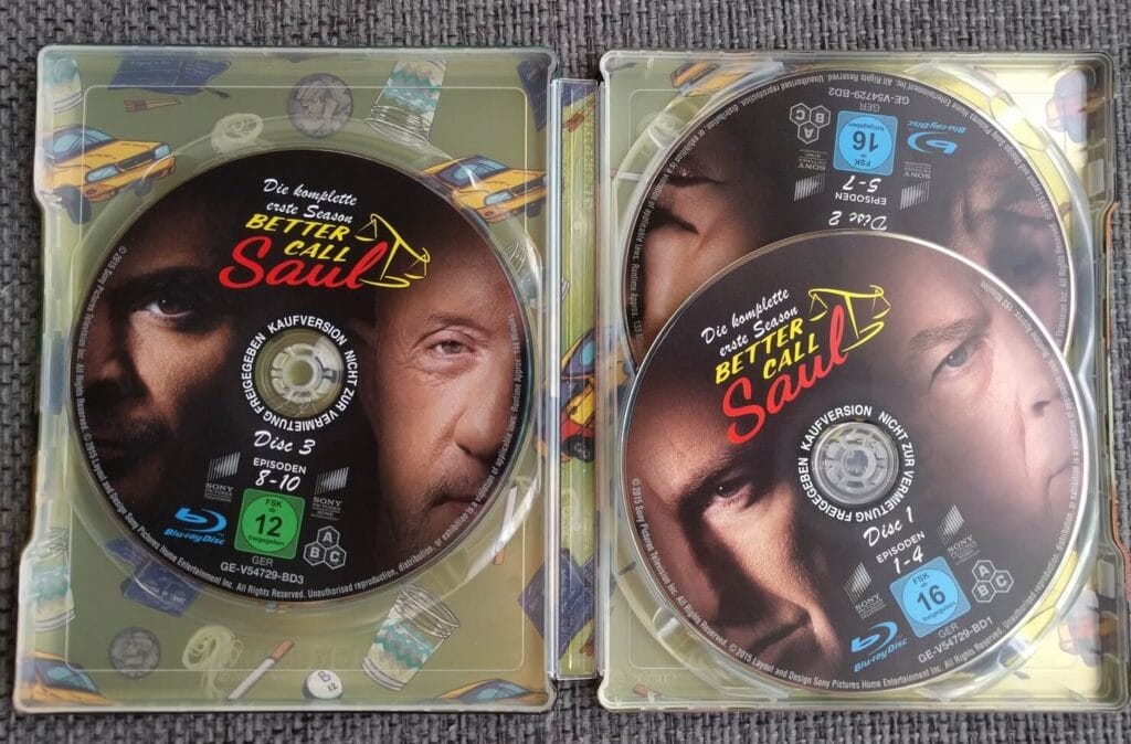 Das Steelbook Design ist etwas ganz Besonderes, da nicht das produzierende Studio (Sony) für das Design verantwortlich war, sondern ein Fan. Es gab nämlich einen internationalen Artwork Contest bei dem die Serienschöpfer Vince Gilligan (Breaking Bad) und Peter Gould ihr favorisiertes Artwork aus allen Einsendungen auswählten. Unter bettercallsaulfanartcontest könnt ihr euch einige der Einsendungen anschauen.