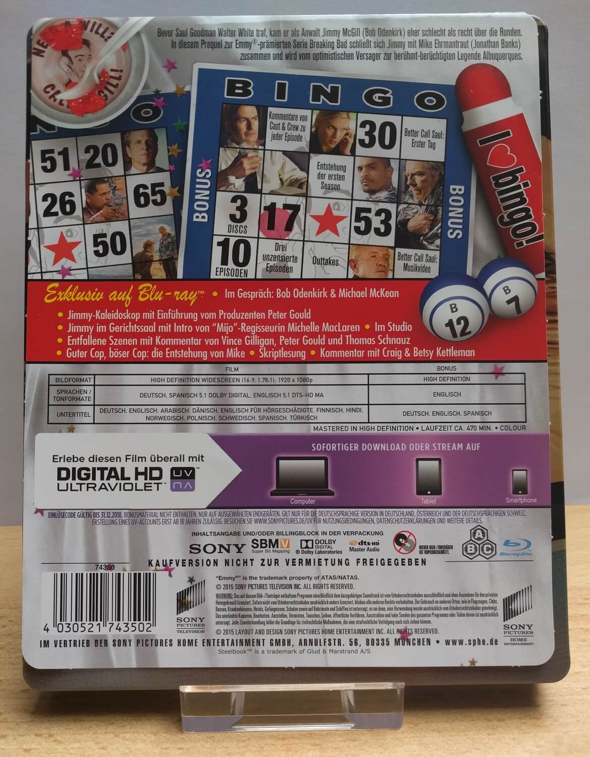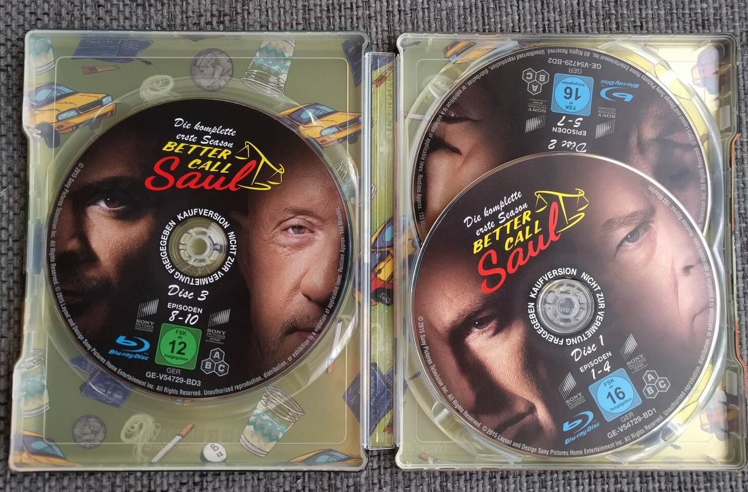 Das Steelbook Design ist etwas ganz Besonderes, da nicht das produzierende Studio (Sony) für das Design verantwortlich war, sondern ein Fan. Es gab nämlich einen internationalen Artwork Contest bei dem die Serienschöpfer Vince Gilligan (Breaking Bad) und Peter Gould ihr favorisiertes Artwork aus allen Einsendungen auswählten. Unter bettercallsaulfanartcontest könnt ihr euch einige der Einsendungen anschauen.