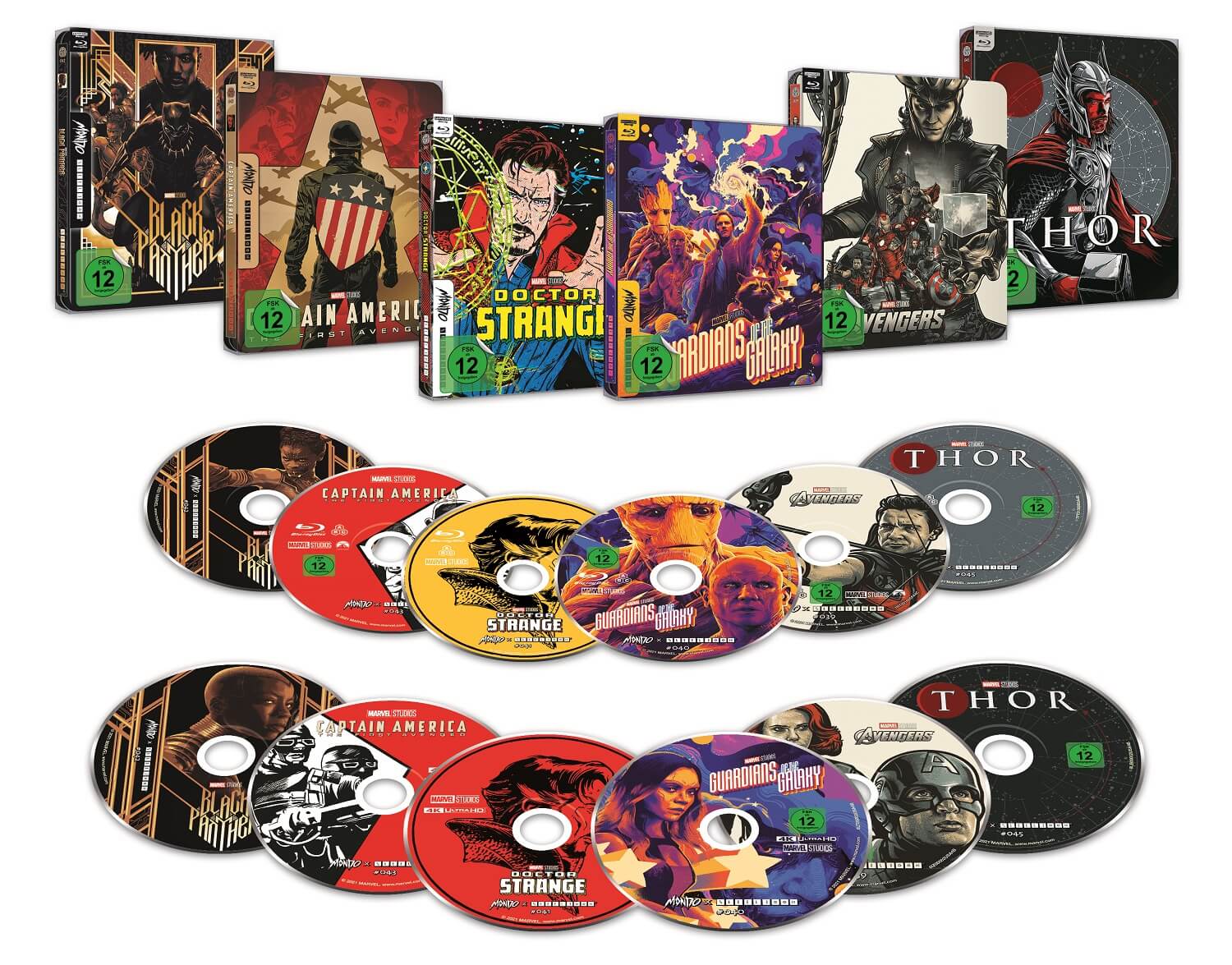 Typisch für Mondo Steelbooks gibt es neben dem charakteristischen Mondo-Comic-Stil jeweils einen transparenten Schuber, der mit einer hochwertigen Folie bedruckt ist. Alle diese 4K Marvel Steelbooks enthalten jeweils die 4K UHD Blu-rayTM sowie die Standard Blu-rayTM mit umfangreichen Extras.