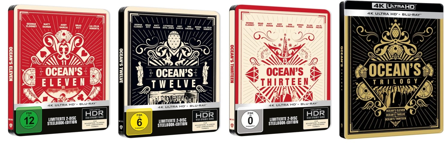 Am 2. Mai 2024 erscheinen in Deutschland 4K UHD + Blu-ray Steelbooks zur Ocean’s Trilogie. Im Ausland wird es eine Gesamtedition mit allen drei Filmen auf je einer 4K Disc in einem Steelbook geben. Ob es eine deutsche Veröffentlichung des Trilogie-Steelbooks geben wird, ist aktuell noch nicht bekannt.